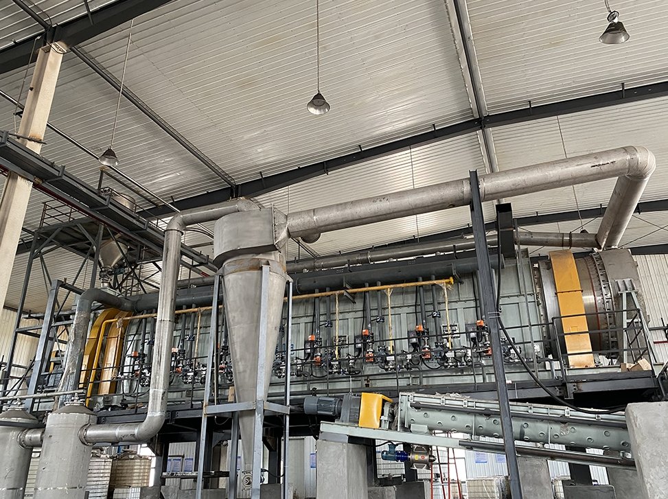 前段工序排出的颗粒状物料经过进料螺旋均匀加入碳化炉内,炭化炉内筒体在天然气烧嘴的加热下,对筒体内的物料进行高温炭化,炭化完的物料在焙烧炉的转动下排出至冷却筒体中冷却,冷却后的物料排出过筛除去炭化物。