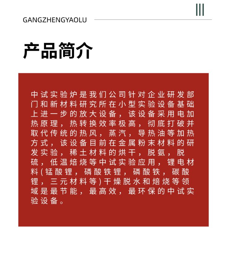 陕西罡正窑炉科技有限公司的GZ-JX 中试实验炉是一款专为企业研发部门和新材料研究所设计的电加热设备,主要用于金属粉末、稀土材料、锂电材料等领域的中试实验。以下是基于公开信息的详细解析: