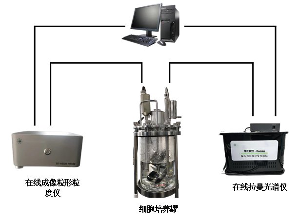 本系统是以原位显微镜和在线拉曼光谱仪作为 PAT 工具,对细胞生长过程的细胞形态、大小、密度和细胞营养物质及代谢产物(五个生化指标:葡萄糖、乳酸、谷氨酸、谷氨酰胺、铵离子)浓度进行实时在线检测和分析。原位显微镜实时拍摄细胞图像,实时得到细胞的直径分布,并估算细胞密度。通过在线拉曼光谱仪实时获取体系的拉曼光谱,建立光谱数据与生化指标浓度的多元校正模型,实时分析细胞培养过程中的生化指标浓度。