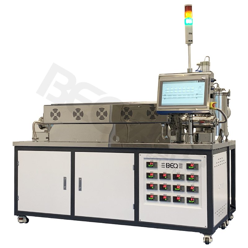 BOF-7-100是一款用于有机小分子升华提纯的专用设备。电气控制采用控温仪表与触屏组合操控,其控温精确且操作直观简便。仪表及触屏均采用国内**品牌,质量精确可靠。7段炉膛温区长度100+250+100+150+150+100+100mm,炉膛间格挡厚度10mm,7段温区14点控温,可以电动开启,并装有散热风扇,使降温更快。配备100mm口径炉管,装载量更大。使用电阻丝加热,具有独特的抗氧化性。保温材料采用真空吸附成型的氧化铝纤维无机材料,环保节能。左端法兰采用可滑动结构,使炉管拆卸清洗简单方便,炉管与法兰之间采用聚四氟垫片填充缝隙,减少污染源,另配有观察窗、进气截止阀与预留KF16真空接口。右端法兰采用简化结构,炉管与法兰之间采用聚四氟垫片填充缝隙,减少污染源,配有旁抽截止阀、细抽截止阀与真空计接口。右端法兰的CF100接口连接气动插板阀,插板阀后端装有冷却过滤井,配备德国莱宝磁悬浮分子泵与莱宝真空泵。在右端法兰与插板阀件配备静态过滤网。整个管路接口采用金属密封+氟橡胶密封结构,提高真空性能。本设备按配备有一路质量流量计,选用七星D07-26C系列,氮气标定。量程5slm,采用国内**品牌,质量精确可靠。气体经流量计后从炉管的左右端分别进入,气流相对平稳,使对升华材料的影响降到*低。本设备结构采用金属壳体承重,颜色采用定制橘纹白,设备外观简洁明快,更具备操作直观方便、控温精确、真空优良等性能。