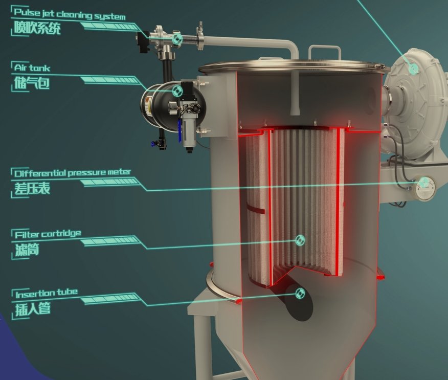 滤材可选配滤袋、滤筒或者钛材滤芯。