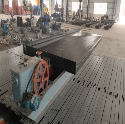 (2)床面:外形呈直角梯形,一般尺寸为4500×1850×1560mm(长度×传动端宽×精矿端宽),其他型号多应用于实验等特殊情况分选(详见技术参数)。床面由聚氨酯玻璃钢包裹钢骨架制成,工作表面为特制耐磨层,床条用耐磨材质注入模具与床面同时一次成型,一般床条走向与传动方向平行(直槽型),分为橡胶床面及漆灰刻槽床面两种,橡胶床面多用于选别粗砂,漆灰刻槽床面又分为粗砂(2-0.5mm)床面(46槽,60槽),细砂(0.5-0.074mm)床面(88槽,100槽,110槽),矿泥(0.074-0.037mm)床面(136槽),综合性回收(2-0.037mm)床面(直槽120槽),但亦有将床条中间一段布置成倾斜状的,成为波形床面(单波床面和双波床面),在倾斜条区轻矿物易于排出,因而有助于提高设备处理能力并增加金属回收率(波形摇床),也有特殊床面用于钨矿脱硫(台浮摇床)。