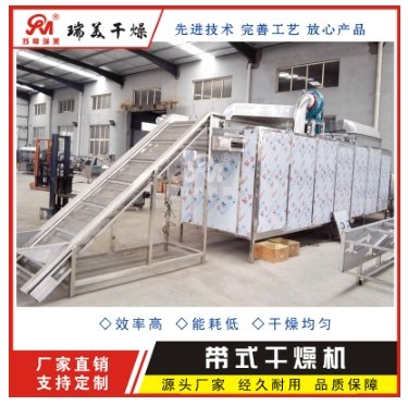 将所要处理的物料通过适当的加料机构,如星型布料器、摆动带、粉碎机或造粒机,分布在输送带上,输送带通过一个或几个加热单元组成的通道,每个加热单元均配有空气加热和循环系统,每一个通道有一个或几个排湿系统,在输送带通过时,热空气从上往下或从下往上通过输送带上的物料,从而使物料能均匀干燥。