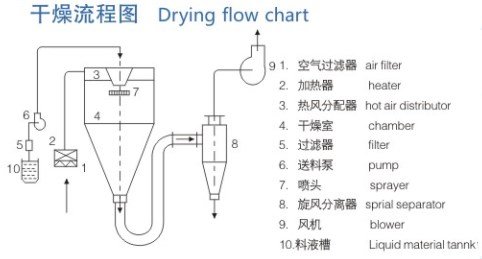 空气通过过滤器 "1" 和加热器 "2" 进入干燥室顶部的热风分配器 "3",热空气呈现螺旋状均匀地进入干燥室 "4"。料液经过过滤器 "5",由泵 "6" 送至在干燥室顶部的离心喷雾头 "7",被喷成极小的雾状液滴,以极大的表面积与热空气接触,水份迅速蒸发,在极短的时间内干燥成颗粒制品,在塔底和旋风分离器 "8" 中捕集,湿废气由风机 "9" 排至室外。(见干燥流程图)。