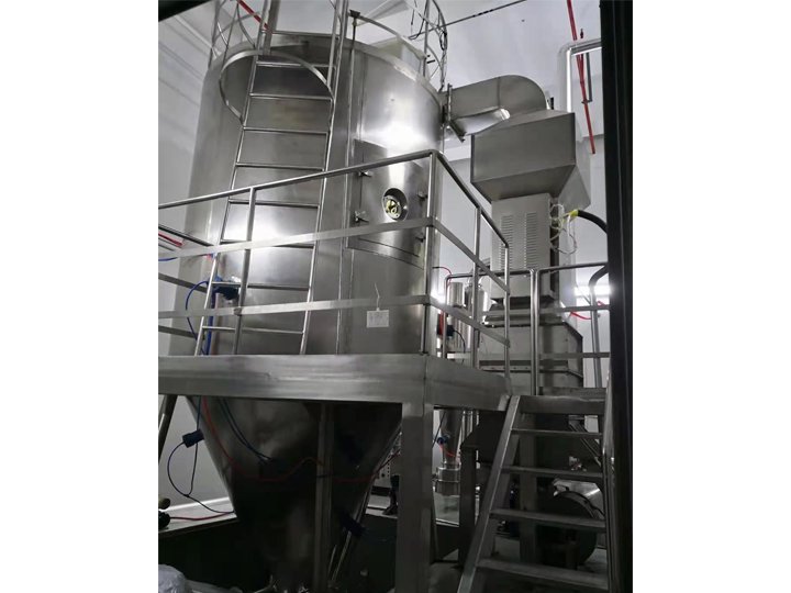 空气通过过滤器和加热器,进入干燥器顶部的空气分配器,热空气呈现螺旋状均匀进入干燥器。料液由料液槽经过滤器由泵送至干燥器的离心雾化器,使料液喷成极小的雾状液滴,料液和热空气并流接触,水份迅速蒸发,在极短时间内干燥为粉末状成品,成品由干燥塔底部和旋风分离器排出,废气由风机排出。
