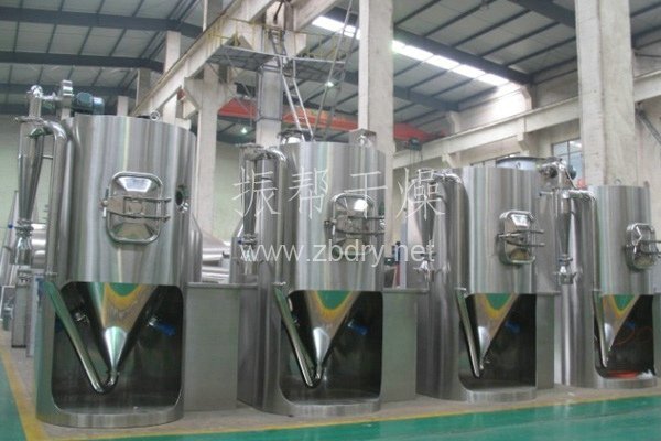 空气经过过滤和加热,进入干燥器顶部空气分配器,热空气呈螺旋状均匀地进入干燥室。料液经塔体顶部的高速离心雾化器,(旋转)喷雾成极细微的雾状液珠,与热空气并流接触,在极短的时间内可干燥为成品。成品连续地由干燥塔底部和旋风分离器中输出,废气由风机排空。