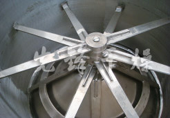 为了能将待干物料连续、均匀、定量地输送入干燥主机进行干燥作业,在湿料斗内靠近螺旋的部位设置了破拱的搅拌装置,速度和螺旋转速相同。同时,针对电池材料滤饼具有粘性的特点,输送螺旋设计成双螺旋结构,螺旋片相互错开设置,且互相切入。这样就很容易互相破坏粘性物料“抱轴”现象,双螺旋具有自清理功能,并使用变频器调整转速。