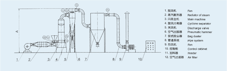 鼓风机→空气加热器→闪蒸干燥主机→旋风分离器→布袋除尘器→引风机