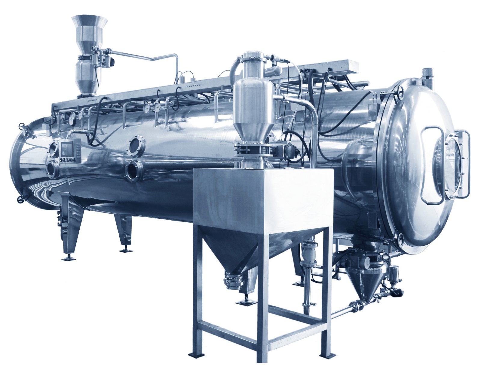 根据客户产能的大小,在真空容器内设计布置3-11层传送带,通过连续固体进料器和布料器,将客户所需要干燥的原料在真空条件下实现连续送料,并均匀的布放在干燥带上,由于物料在干燥过程中不断翻动,所以加快了蒸发速度和时间,保证产品在干燥过程中的均匀性,干燥的温度在20-150℃可调,物料从进入干燥机到干燥后出料约20-80分钟可调。干燥后的产品如需粉碎工艺,可在真空条件下粉碎,避免了粉尘飞扬,增加了产品收率和解决了污染等问题。干燥后的产品通过真空连续出料器和真空收料机实现连续出料,同时可实现有机溶剂的回收,解决了环保问题并增加溶剂回收收益。