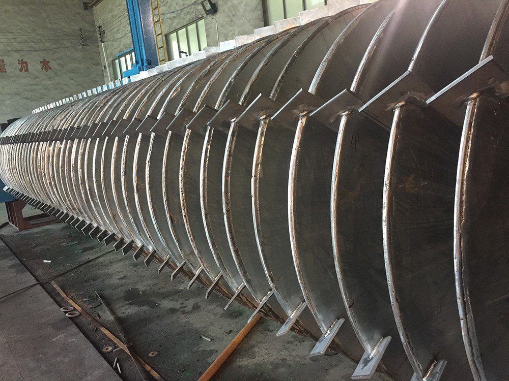 泥圆盘干燥机作为一种污泥间接加热干化设备在几十年前就已经应用于化学工业,食品工业以及饲料工业。现在已经发展为相当成熟的干化工艺,在国际市场上占有率也非常高。污泥焚烧的共同特点是以回收能源为目的。污泥的热值低,一般需要添加辅助燃料,所以应该设计辅助燃料少的流程,而流化床工艺就是其中之一。圆盘干燥机主体由一个圆筒形的外壳和一组中心贯穿的圆盘组成。圆盘组是中空的,热介质从这里流过,把热量通过圆盘间接传输给污泥。污泥在圆盘与外壳之间通过,接受圆盘传递的热,蒸发水份,污泥水份蒸发形成的水蒸气聚集在圆盘上方的穹顶里,被少量的通风带出干化机。圆盘干燥机的圆盘有两个作用:一是它给污泥提供足够大的换热面积,二是它缓慢转动,它上面的小推进器推动污泥向指定的方向流动并起到很好的搅拌作用。圆盘干化机利用每个圆盘的双面传热,可以在小空间里提供很大的换热面积,这使得圆盘干燥机体型紧凑。圆盘的转动变频可调,转速约为5r/min,因此磨损很小。圆盘盘面与轴是垂直的,所以它本身的转动不影响污泥的流向,圆盘干燥机的圆盘边缘有一些小桨叶,这些小桨叶有一定的倾角,既帮助污泥定向流动,双起到搅拌的作用。外壳是不动的,它容纳污泥和污泥蒸发产生的水蒸汽。外壳内壁有固定的刮刀。刮刀很长,伸到圆盘之间的空隙,防止有大块污泥固结在盘片上。与圆盘上的桨叶类似,固定刮刀也起到搅拌的作用。