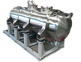 VH型为分批式卧式干燥机,振动机构通过安装在主体下部的振动源产生圆周方向的圆振动。 被干燥物以圆周上下方向的运动为主体。 VHS型是放入滚珠等介质同时进行干燥、破碎的机型。 连续供给浆料和糊状原料,干燥后分批排出。 排出阀上安装有狭缝,只有干燥粉末与介质分离后排出。 另外,也适合于凝聚形成碎块的原料。