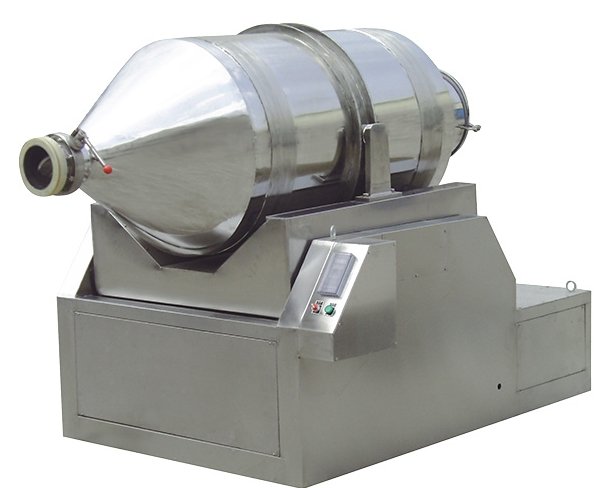工作原理二维混合机主要由转筒、摆动架、机架三大部分组成。转筒装在摆动架上,由四个滚轮支撑并由两个挡轮对其进行轴向定位,另两个转动轮由传动动力系统拖动使转筒产生自转;摆动架由一组曲柄摆杆机构装在机架上,并由轴承组件支撑。二维混料机的转筒可同时进行两个方向运动,一个是转筒的自转,另一个是转筒自转的同时随摆动架摆动。被混合物料在转筒内随转筒自转、翻转、混和的同时,又随转筒的摆动而发生左右来回的掺混运动,在这两个运动的共同作用下,物料在短时间内得到充分的混合。