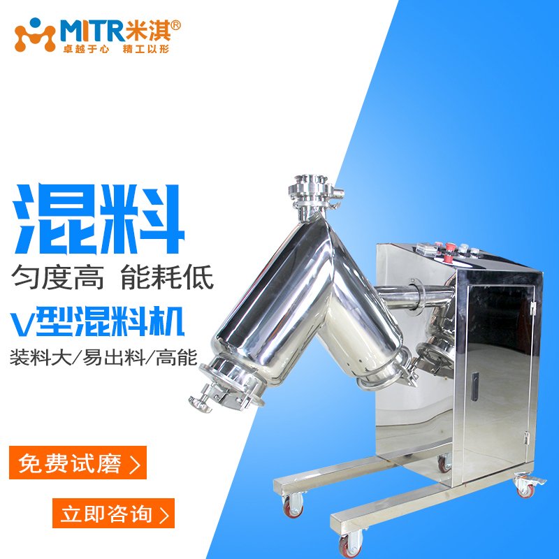 V维混料机是通过混合筒空间上的翻转运动,来消除物料因离心力作用产生的比重偏析,分层,积聚现象,实现多种物料之间相互流动,扩散,从而达到快速、均匀地混合物料。