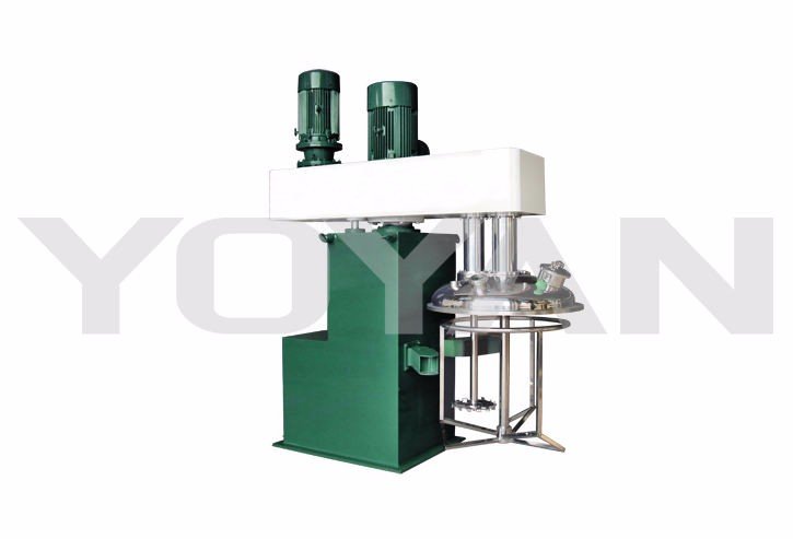 分散盘通过高速运转,使物料呈环状流,产生强旋涡,呈螺旋状下降到涡流底部。粒子间产生强烈的剪切撞击与磨擦,达到迅速分散、溶解功能。框式带挂壁搅拌对缸壁进行刮试,加速物料循环,提高分散效率,通过液压泵工作驱动液压柱塞升降,带动整个传动机构和工作组升降。