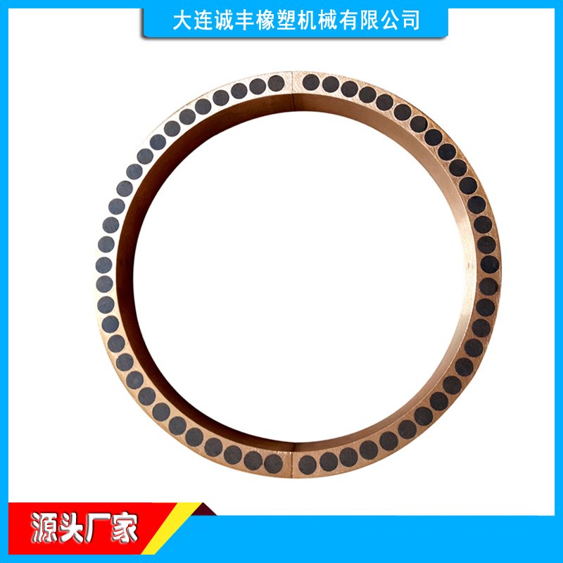 大连诚丰橡塑机械有限公司密炼机密封铜环采用:锡青铜材质加工生产,采用对开两半设计,方便更换。且数控车床加工后精度高。大连密密机密封铜瓦与轴端的合金环以及外部的弹簧共同完成密封。合金环的寿命是铜密封环的3~4倍。 大连密炼机密封铜圈上有黑色石墨,起无油润滑作用。