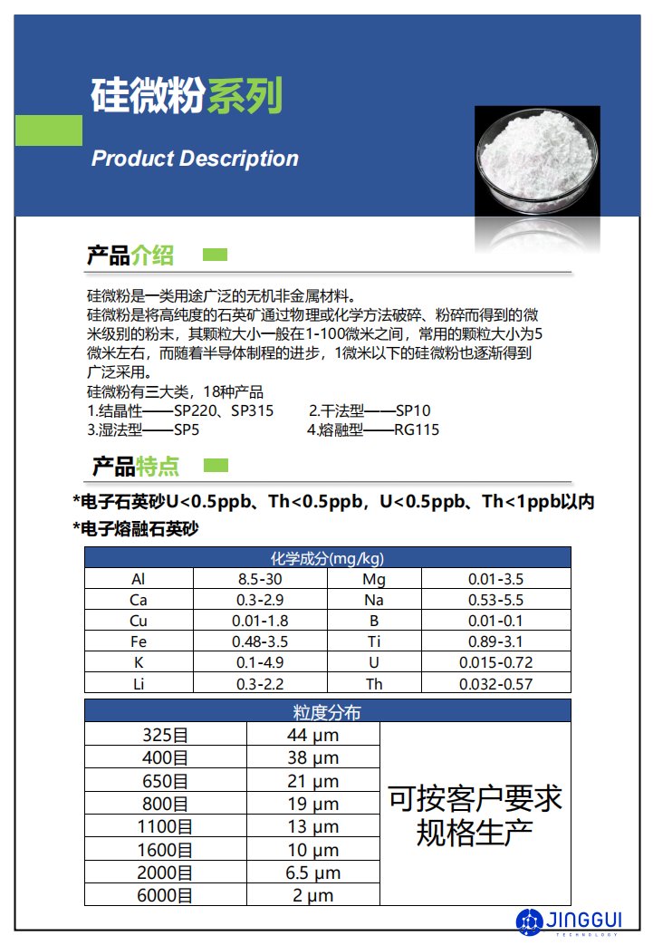 硅微粉是将高纯度的石英矿通过物理或化学方法破碎、粉碎而得到的微米级别的粉末,其颗粒大小一般在1-100微米之间,常用的颗粒大小为5微米左右,而随着半导体制程的进步,我司可达到2.5微米。
