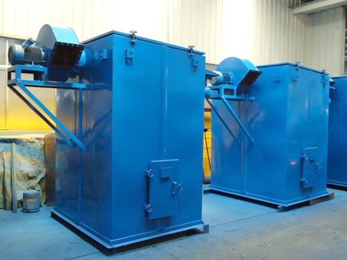 含尘气体由单机除尘器进风口进人箱体,通过滤袋进行过滤,粉尘被留在滤袋内表面,净化后的气体通过滤袋进人风机,由风机吸入直接排入室内(亦可以接管排出室外)。随过滤时间的增加,滤袋内表面黏附的粉尘也不断增加,滤袋阻力随之上升,从而影响除尘效果;采用自控清灰尘机构进行定时控振清灰或手控清灰机构停机后自动摇振数十秒,使粘在滤袋内面的粉尘抖落下来,粉尘落到灰门、抽屉或直接落到输送皮带上。