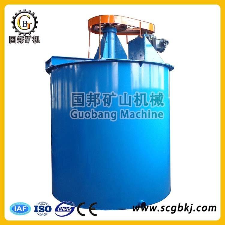 搅拌桶是由电动机三角带传动代动叶轮旋转,将药物和矿浆充分混合均匀,增加药剂作用反应时间强化药物反应质量的必要设备,搅拌桶适用于选矿业,也可用作各种化工业的搅拌。它使用于浓度不大于30%(按重量计算)固体成分的粒度小于1mm它的形式是平底桶形辐射循环螺旋叶轮机械搅拌式。 搅拌桶使用说明 使用前先紧固泵体部位螺栓,转动泵轴代轮是否灵活,然后开机运行,其它同浮选机。易损件:叶轮,定子。