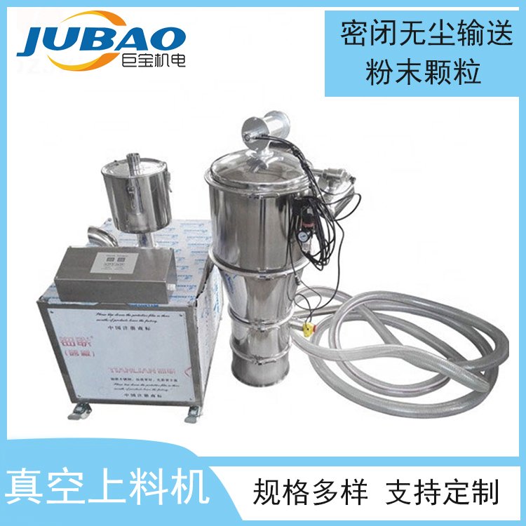 真空上料机又叫真空输送设备,工作原理是利用真空泵抽气从而使吸料嘴进口处及整个系统处于一定的真空状态,粉粒料随同外界空气被吸入料嘴,形成料气流,经过吸料管到达料斗,在料斗中进行气、料分离。分离后的物料进入受料设备。● 减少环境及人员对物料的污染,提高洁净度。● 占用空间小,能够完成狭小空间的粉料输送,使工作空间美观大方,不受长短距离限制。● 整个输送过程在密闭的系统内进行,不会发生粉体泄露。