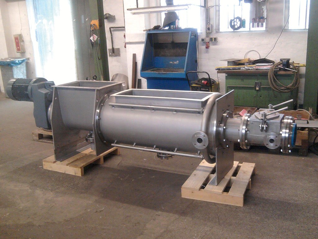 湿酒糟传送带位于酿造车间的过滤桶/糖化醪过滤器下方。麦糟通过下落斜槽进入湿麦糟输送机的输送螺杆。输送螺杆将酒糟推入与输送机出口相连的管道中。在管道中,在塞式输送操作中,通过压缩空气或蒸汽气动输送酒糟。