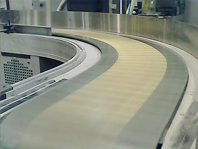 链板输送机以标准顶板为承载面,由马达减速机为动力传动,运行在专用的导轨中,输送面平坦光滑,摩擦力小,物料在辎送之间过渡平衡,根据工艺流程不同,链板线分为直行及转弯形材质分为热塑钢及不銹钢,适合输送物料一般为塑料瓶、玻璃瓶、易拉罐、等包装产品、也可输送纸箱、袋包包装的产品。我们可以通过制作多排一体,使输送面变的很窄,并形成速度差,使多列在无挤压的情况下变成单列,同样也可以单列变成多列并行走缓慢从而实现物流在输送过程中的储存。