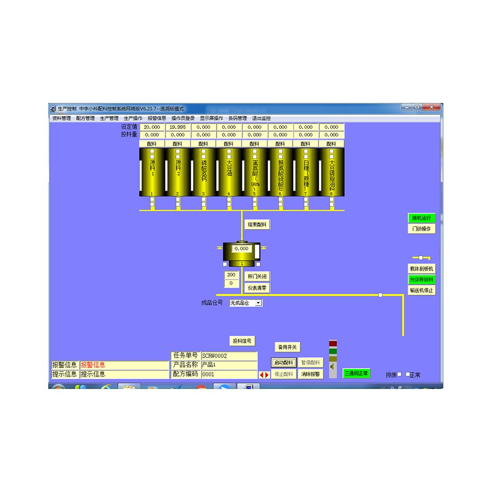 JOYU自动配料系统设计有检测设备功能,对料仓或阀门输出启停控制、各秤门开关到位信号、混合机开关门到位信号、人工投料门到位信号、液体完成信号等通过系统直接检测,方便快捷,直观形象。