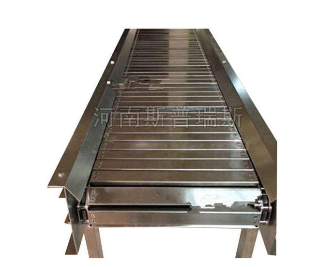 板链输送机适用于形状不规则物品的重载输送。链条选用空心大辊子带附件链条,在两侧同步链条的附件上用板状构件连接使输送方向形成连续的平板,因而运行平稳。该机与链式或辊筒输送机配合使用可实现转角输送。