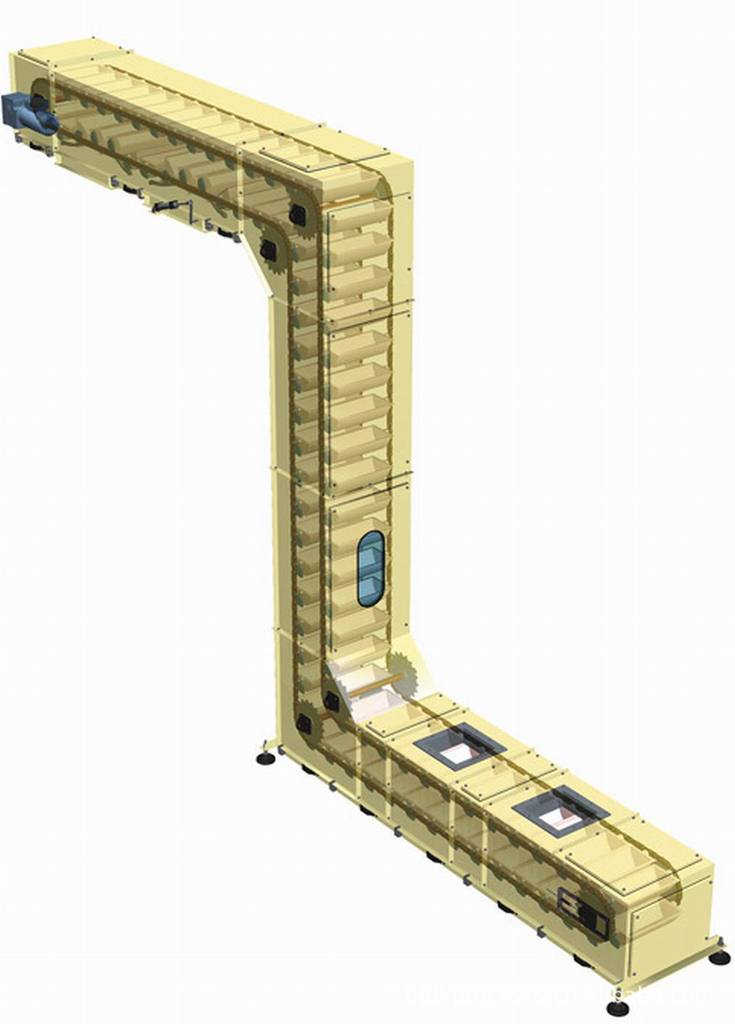 Z型斗式提升机在单一动力方向上运行,从横向-纵向-横向转换角度。产品在传递过程中不会发生溢料、递落、撒粉、混料等情况,使得在一个非常小的空间对物料集成配置是有可能的。
