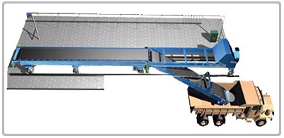 该装车机由平形胶带机、卸袋机械、端部溜槽、中间溜槽等组成。平形胶带的支架采用钢板折弯结构、即美观又牢固驱动装置采用摆线针轮减速机,节省占地面积;张紧方式中垂直螺旋张紧。卸袋机械邮旋臂立式胶带机、电动推杆和支架三部分组成,当不需求泥袋从中间位置卸下时,立式胶带机外于包装带机的侧边;当需要水泥袋从中间位置卸下时,由电动推杆立式胶带使其摆动与包装胶带机纵向成交叉位置,并开动立式胶带机即可,立式胶带机的两个摆动的极限设有限位开头,其在工作和非工作状态下的定位由限位开头来实现。特殊设计的溜槽能使水泥袋恰好落到接续胶带机的中心位置。