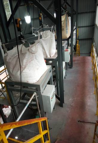 由人工解开吨袋口,用夹袋器将大袋的袋口夹紧,使物料通过自身重力落入下方过渡仓中,过渡仓采用双通道式,整个开袋过程全密闭操作,无粉尘泄漏,有效降低人工强度。