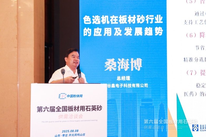 2025年8月8日,备受行业关注的第六届全国板材用石英砂会议在圆满完成各项议程后顺利闭幕。作为行业内影响力很大的盛会,本次会议汇聚了国内外板材及石英砂领域的专家学者、企业代表与资深从业者,共同探讨行业发展新趋势、技术创新方向及市场机遇,为推动板材用石英砂产业高质量发展注入了强劲动力。在本次会议上,公司总经理桑海博受邀发表重要讲话。桑总围绕当前色选机在板材砂行业的广泛应用及未来发展趋势展开深入分析,并分享了谷鑫在石英砂...