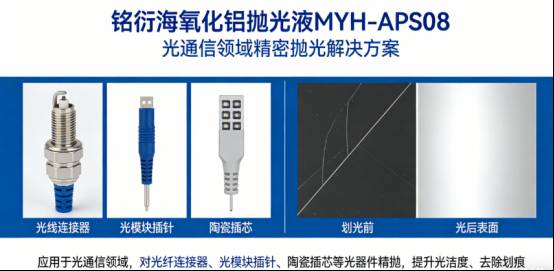 氧化铝抛光液 MYH-APS150一、氧化铝抛光液MYH-APS150简介氧化铝抛光液MYH-APS15是光通讯、精密金属加工等领域的核心耗材,尤其在光纤器件、不锈钢制品精密加工中发挥关键作用,核心作用是通过精密研磨抛光,去除光纤、不锈钢工件表面细微划痕、杂质及损伤层,提升表面光洁度与平整度,确保光纤传输性能、不锈钢产品品质达到行业严苛标准,助力两大领域产品升级提质。精准提升表面精度,实现镜面级抛