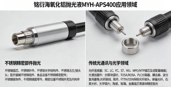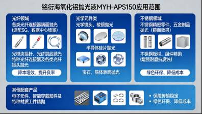 氧化铝抛光液MYH-APS400一、氧化铝抛光液MYH-APS400简介氧化铝抛光液 MYH-APS400是光通讯器件、精密光学元件及不锈钢精密部件生产中的核心抛光耗材,通过氧化铝磨料的温和精密研磨,高效去除工件表面细微划痕、毛刺、氧化层及加工瑕疵,显著提升表面光洁度、平整度与镜面效果,确保工件满足高精度光学、物理及外观性能要求,保障装配稳定性与使用寿命。二、铭衍海氧化铝抛光液MYH-APS400