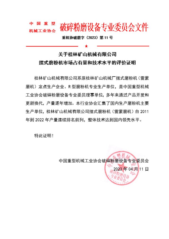 近日,中国重型机械工业协会破碎粉磨设备专业委员会发布了关于桂林矿山机械有限公司摆式磨粉机市场占有量和技术水平的评价证明,这一证明不仅是对桂林矿山机械有限公司在摆式磨粉机领域所取得成绩的认可,更是对其技术实力和市场地位的权威肯定。桂林矿山机械有限公司作为原桂林矿山机械厂摆式磨粉机(雷蒙磨机)的定点生产企业,以及R型磨粉机的专业生产单位,一直以来都在破碎粉磨设备行业中扮演着举足轻重的角色。该公司不仅是