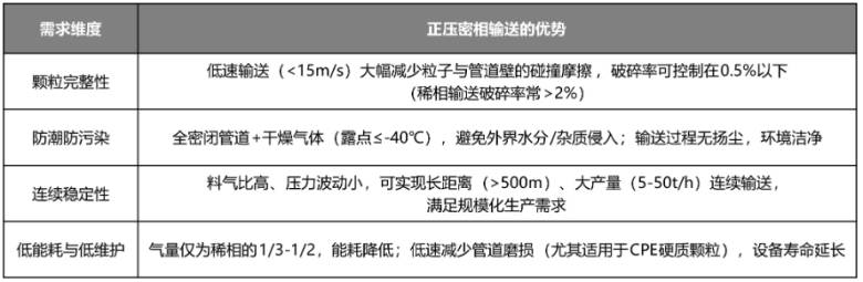 正压密相输送系统凭借其低速、低磨损、高稳定性、密封性好的特点,在CPE(氯化聚乙烯)塑料粒子行业中逐渐成为主流的输送方式之一。CPE作为高性能弹性体材料(常用于电线电缆、防水卷材、管材等领域),其颗粒对输送过程的完整性、洁净度、防潮性要求较高,而正压密相输送恰好能解决传统稀相输送(高速、高磨损、易破碎)或机械输送(易污染、能耗高)的痛点。以下从应用场景、技术适配性、关键设计要点及实际价值等方面展开
