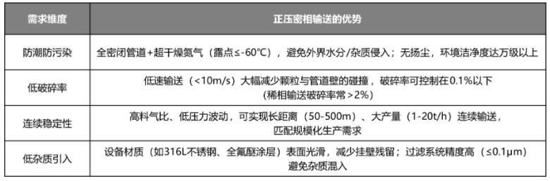六氟磷酸锂(LiPF₆)作为锂离子电池电解液的核心原材料,其高腐蚀性、强吸湿性、对水分/氧气敏感的特性对输送系统提出了极高要求。传统输送方式(如稀相气力输送、机械传送带)易因高速气流导致颗粒破碎、吸潮分解或引入杂质,而正压密相输送凭借低速、高密封性、低破碎率的优势,成为六氟磷酸锂生产及加工环节中关键的输送技术。以下从特性匹配、核心挑战、系统设计及应用价值等方面展开分析:一、六氟磷酸锂的特性与输送核