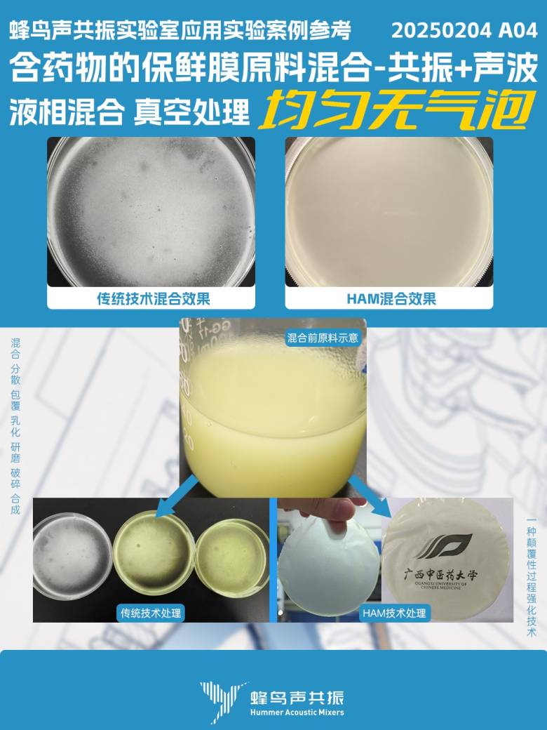 蜂鸟声共振技术通过(低频声波+机械共振)可实现微纳米级粉体、高粘稠、高固含、大密度差、大质量比、高敏感等各种类型物料的处理。本期案例是在真空环境下混合含药物的保鲜膜原料,从图中可以看出,在传统技术下原料混合干燥后存在大量气泡。而在蜂鸟声共振(HAM)技术混合干燥下的保鲜膜料体均匀,纳米级材料均匀分散,成膜后无气泡,质量优异。PS:案例来源-广西中医药大学上图是混合原料,下图是蜂鸟声共振混合后成膜传