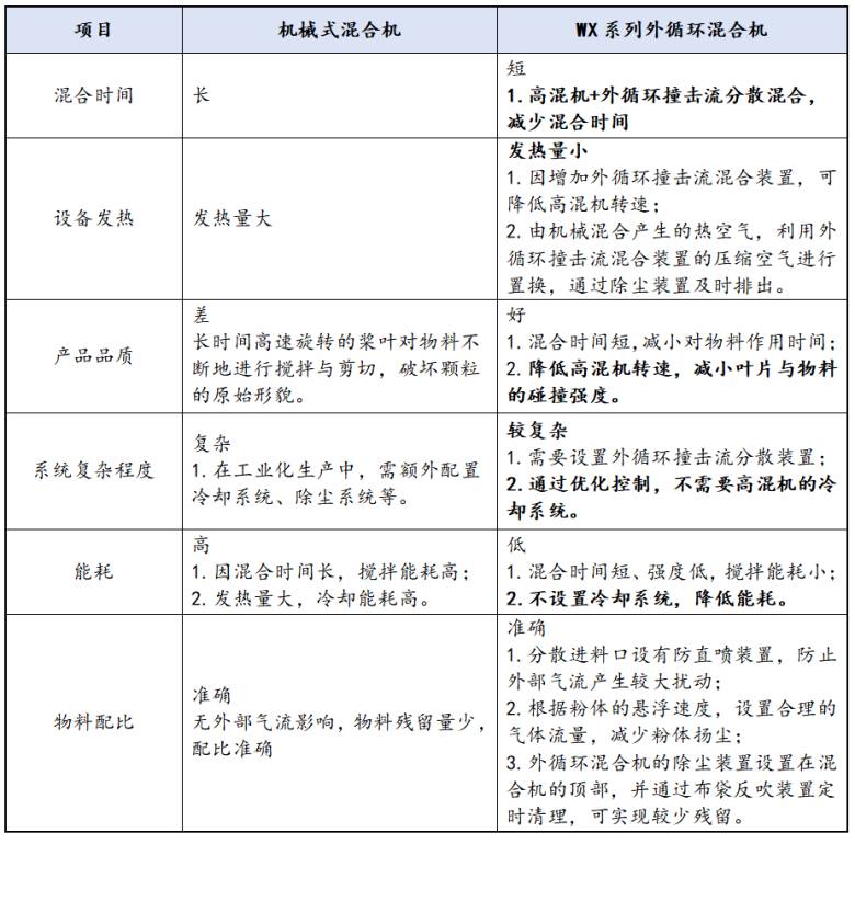 1、项目背景: 目前,在粉体干法混合过程中,通常采用机械式混合机,由于机械混合机的桨叶无法覆盖容器的边缘、角落等区域,混合过程中存在“死区”。另外,当粉体间的粒径、密度、形状差异较大时,易发生“偏析”,导致混合均匀性受限。高速混合机示意图2、WX系列外循环混合机: 湖南经源科技的WX系列外循环混合机通过对机械混合机进行优化,在不影响搅拌效果的前提下,显著提升混合效率与质量,可处理易团聚、密