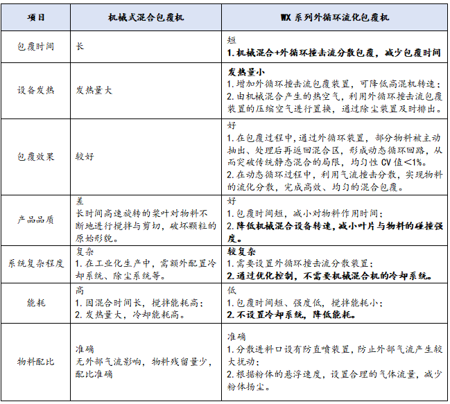 1.项目背景:目前,在高镍三元掺杂磷酸铁锂/磷酸锰铁锂的工艺过程中,通常采用机械式混合机,因机械混合机的桨叶无法覆盖容器的边缘、角落等区域,混合过程中存在“死区”。另外,由于磷酸铁锂(磷酸锰铁锂)/三元之间的粒径、密度、形状差异较大,包覆过程中易产生“偏析”,同时,纳米级磷酸铁锂/磷酸锰铁锂易团聚,包覆均匀性受限。 机械混合机示意图2.WX系列外循环流化包覆机:湖南经源科技的WX系列外