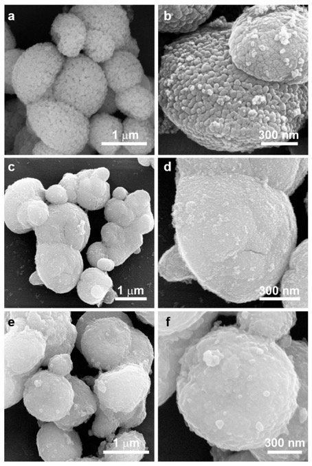 a,b 图为纯的介孔 TiO2,在飞纳电镜下,可以清晰的看到介孔的结构,TiO2 微米球由纳米晶组装而成;c,d 图,是为退火处理过的纯 TiO2,在飞纳电镜下,可以清晰的看到 TiO2 微米球的表面介孔结构发生了变化,这种纳米尺度的表面变化直接可在 SEM 电镜下观测到,得益于飞纳台式场发射扫描电镜的高分辨率成像;e,f 图是纯 TiO2 负载红磷后的形貌,在飞纳电镜下,直接观察到 TiO2 颗粒表面的介孔结构完全消失,说明红磷已经成功引入进介孔内部。这些实验细节都可以在飞纳台式场发射电镜下直接观察得到。b,d,f 图的放大倍数都在二十万倍,表面细节依然清晰可见。