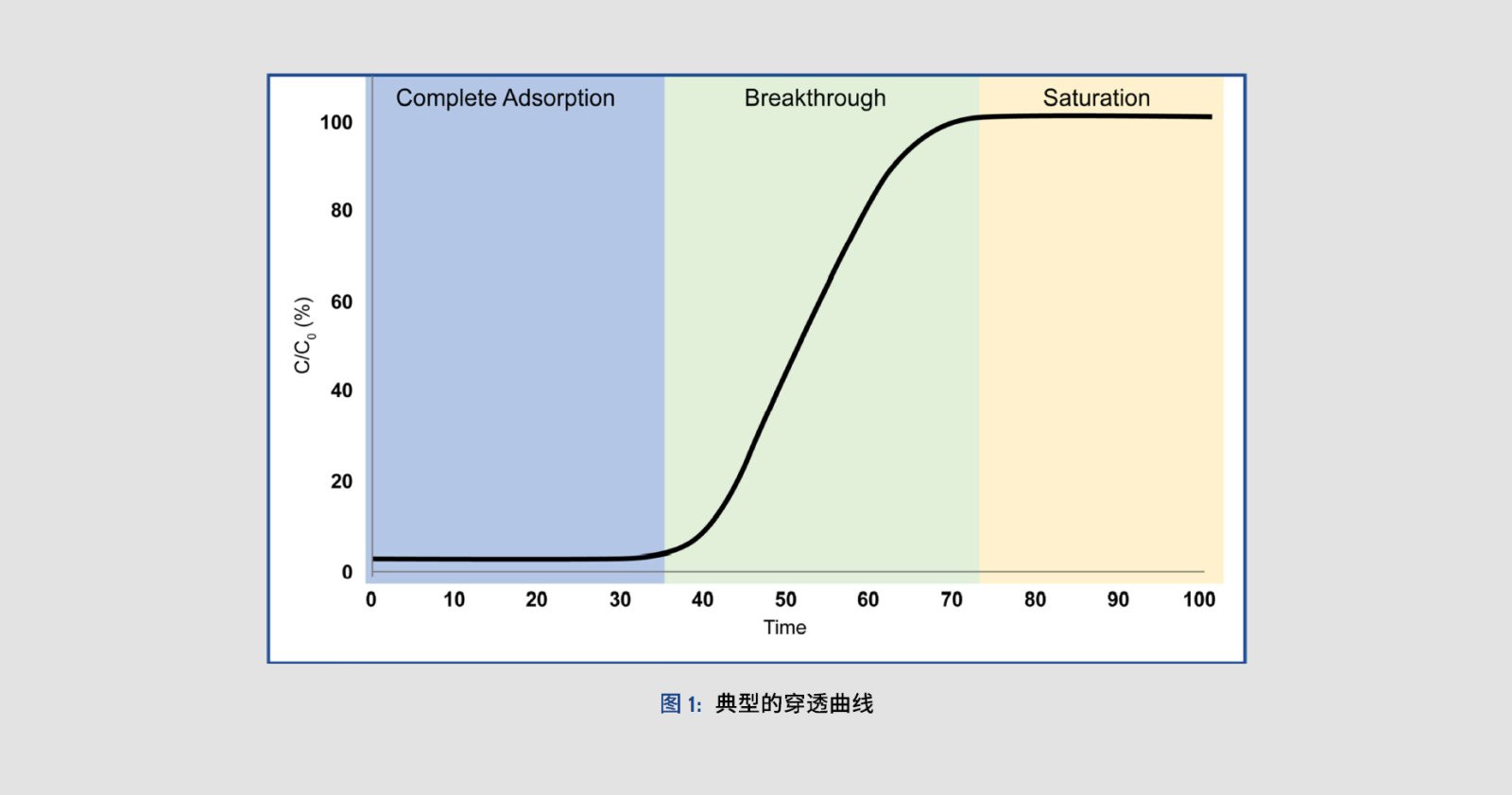 Saturation: 当增大到一定程度时, 穿透曲线渐趋平缓, 相当于传质区已经移出穿透柱顶部,穿透柱内已达到饱和吸附量。
