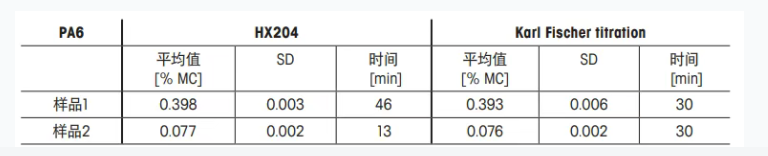 HX204与卡尔费休水分仪的交叉验证 ▼ METTLER TOLEDO 为了证明HX204结果的精确性,我们对具有2种不同水分含量的PA6进行了相关性研究。并且,还将结果与参考方法卡尔费休滴定法进行了比较分析。 研究表明,相对于卡尔费休水分仪,HX204对这2种样品都取得了重复性较好的测定结果。 表1 分别使用HX204 (6次测定)和卡尔费休水分仪(6次测定)进行水分含量测定MC=水分含量,SD=标准偏差) 结果 HX204提供了一种快速、简单的水分测定过程,具有准确、可靠的测定性能,且无需化学试剂或专业实验室人员。所有这些特性,再加上简易的使用方法,为注塑公司提供了快速、简单测定注塑前水分含量的完美解决方案。