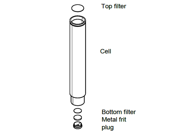 ▲ 图 3:关闭萃取池(从底部开始,使用底滤板、金属滤板和凹面朝向池子的堵头螺丝。将样品装入池中并放置顶滤板。)