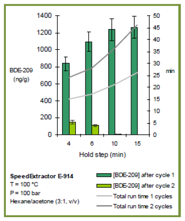 结论: 对于痕量和超痕量分析,延长保持时间是有利的,因为基质膨胀允许溶剂良好渗透并获得最佳回收率。饱和效应可能仅发生在食品/饲料产品中,而对于土壤、污泥和空气样品则不会发生。下图显示了通过增加保持时间同时减少一个循环来确定 BDE-209 [4] 并获得最高回收率的示例。