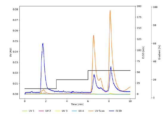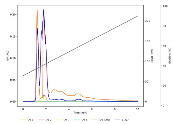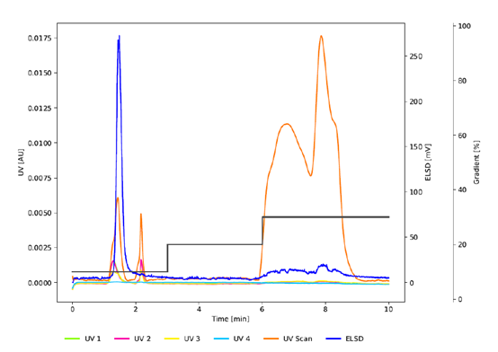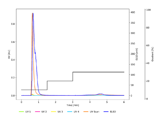 图3 为与 图2 相同条件下的色谱图,使用C18非WP (100 Å) (PrepPure C18, 10 μm)研究孔径的影响。虽然紫外信号表明与C18WP相比,前两个峰的分辨率提高了,但较低的吸光度和ELSD信号表明没有发生有效的分离。C18WP的大孔径(300 Å)使蛋白质能够穿透颗粒并有效地与固定相相互作用。相比之下,PrepPure C18 (100 Å), 10 μm无法实现分离,因为蛋白质只能与颗粒的外表面相互作用。这种有限的相互作用减少了吸附和解吸之间的平衡步骤的数量,从而影响了分离效率。