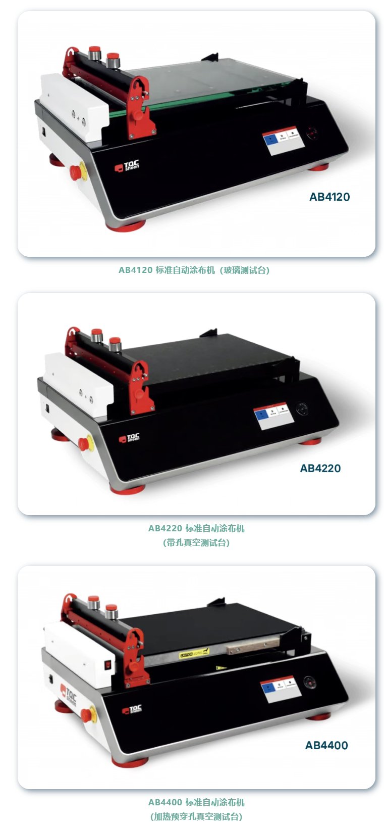 无论在测试各种涂层、油漆和化妆品等成分与材料特性时,涂布机都至关重要。作为测试过程的核心工具,它们用于制备样品,以便进行全面的检查。今天,工业物理就带您详解,如何找到最适合您需求的涂布机。 自动涂布机测试解决方案 TQC Sheen自动涂布机 无论您使用贝克式还是鸟式涂布测试方法,自动涂布机都可以简化流程。 TQC Sheen自动涂布机提供了一种可靠的方法,可将涂层薄膜涂抹到测试图表、面板或箔上。这种方便的涂布机有标准版和加热版可供选择,可确保您可以快速轻松地测试各种样品。 速度、压力和拉伸方向的变化会导致不规则性。此外,剪切速率和涂布机的重量也可能影响结果。而通过使用自动涂布机,这些可变因素能得以稳定,并消除人为因素和错误引入的问题。在整个表面上,涂膜厚度是均匀的。使用自动涂布机创建的样品是可重现的。 TQC Sheen自动涂布机采用先进的技术和精密的设计,确保了涂布过程的高效性和一致性。无论是标准版还是加热版,都能够实现可靠的涂布效果。 在应用上,TQC Sheen自动涂布机适用于各种涂层测试需求,包括涂料、油漆、化妆品等领域。它们可以在实验室和生产现场中广泛应用,满足不同用户的需求。 值得一提的是,TQC Sheen 针对玻璃/纸张/金属基底或箔提供了多种型号与类型的自动涂布机,包括—— 此外,我们还提供AB4320 标准自动涂布机(双通道真空测试台);以及最为基础的AB4420 标准自动涂布机(组合式,不含测试台)。满足您的不同需求与应用。 值得一提的是,每个标准型自动涂布机都配备了 Triple I® 导航工具。Triple I 代表智能照明界面。这种独特的导航工具可引导操作员通过 TQC Sheen 实验室机器的界面。在操作菜单的每个步骤中,界面都会检测哪些按钮处于活动状态,并通过发光的红色中心指示这些按钮。这样就形成了一个非常直观的操作系统,该操作系统通过机器显示屏上的信息得到增强。