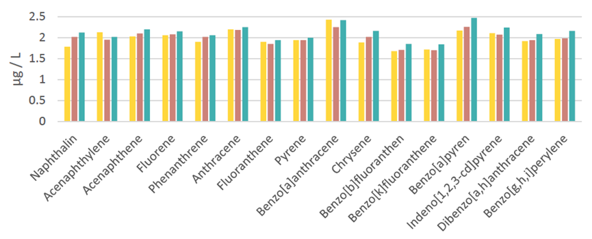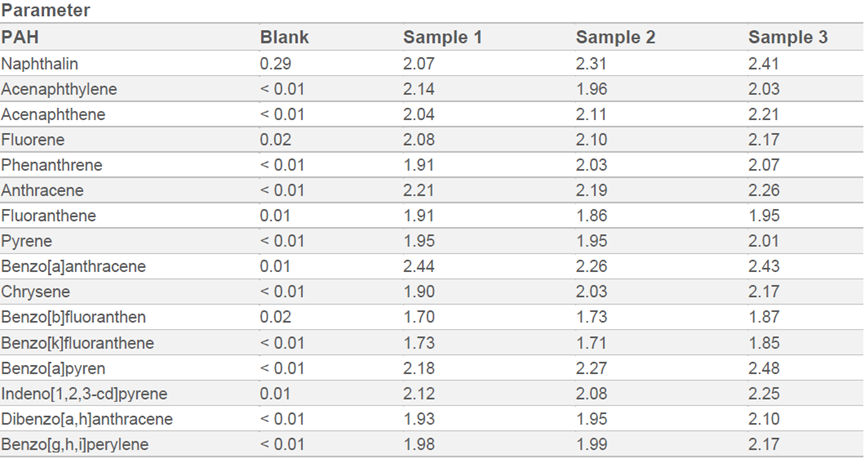 表3:空白和三个样品的 PAH 结果(示例)。加标样品中每种PAH的预期值为 2μg/L。