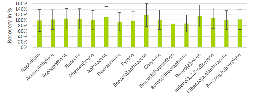 ▲ 图4. 每种 PAH 回收率的平均值。已考虑空白值及其不确定度。置信区间为 95%。