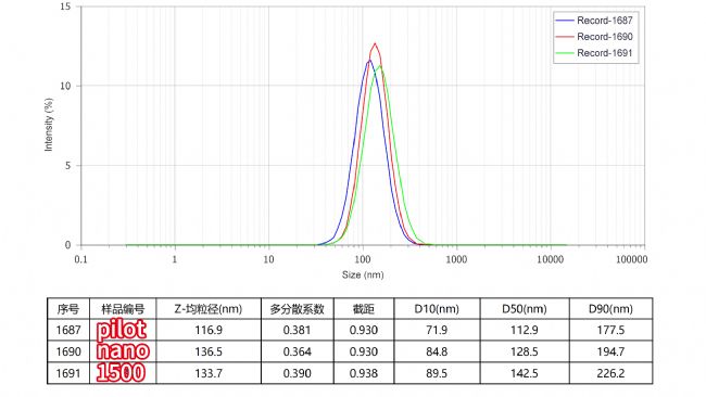 通过安拓思三款不同的高压均质机对酱油进行处理,在1000bar的高压条件下进行多轮循环均质。由实验粒径图(图2)可以看出,AH-pilot这款设备的处理效果最好:粒径由初始的69.92μm 降至 177.5 nm。