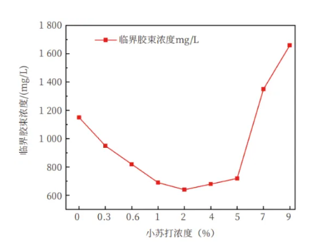 图1 pH=8.0-9.0时小苏打浓度对洗涤剂的临界胶束浓度影响